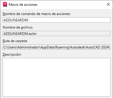 En el cuadro de texto Nombre de comando de macro de acciones del cuadro de diálogo Macro de acciones, introduzca ADDLINEARDIM.