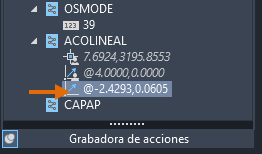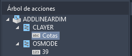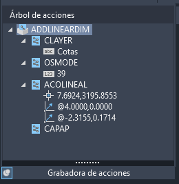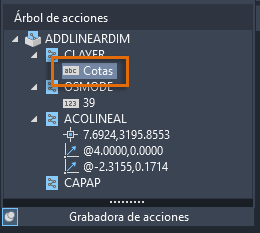 Con el grupo Grabadora de acciones expandido y el Árbol de acciones visible, seleccione el valor de cadena grabado Cotas en la variable de sistema CLAYER y haga doble clic en él; a continuación, escriba el nuevo valor Acota.