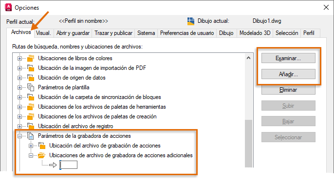 Ubicaciones de archivo de grabadora de acciones adicionales: AutoCAD carga los archivos de macro de acciones que se encuentran en estas ubicaciones como de solo lectura, lo que impide que se realicen modificaciones en ellos.