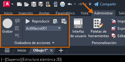 Las macros de acciones se graban mediante la grabadora de acciones ubicada en la ficha Administrar de la cinta de opciones. Considere la grabadora de acciones como la versión de AutoCAD de una grabadora de vídeo digital (DVR) o de audio.