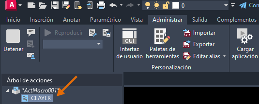 Observe que la variable de sistema CLAYER se graba y se muestra en el Árbol de acciones.