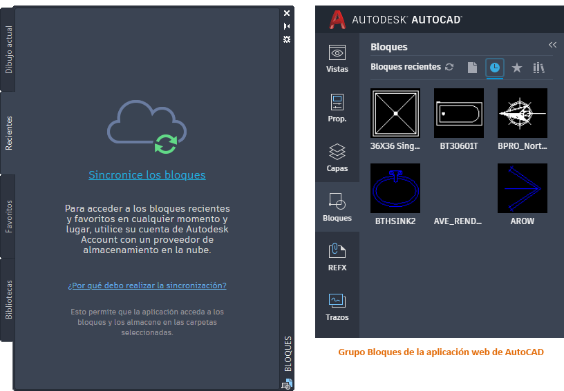 Es posible que la opción Sincronice los bloques no se muestre en la paleta de bloques si ya hay bloques recientes en el dibujo actual o si no ha utilizado la paleta de bloques para iniciar sesión en su cuenta de Autodesk Account.