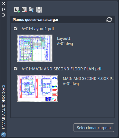 Colabore sobre el terreno mediante el envío de las presentaciones de dibujo como archivos PDF a Autodesk Docs. Seleccione presentaciones de varios dibujos y cárguelas como archivos PDF en la carpeta de proyecto seleccionada de Autodesk Docs.