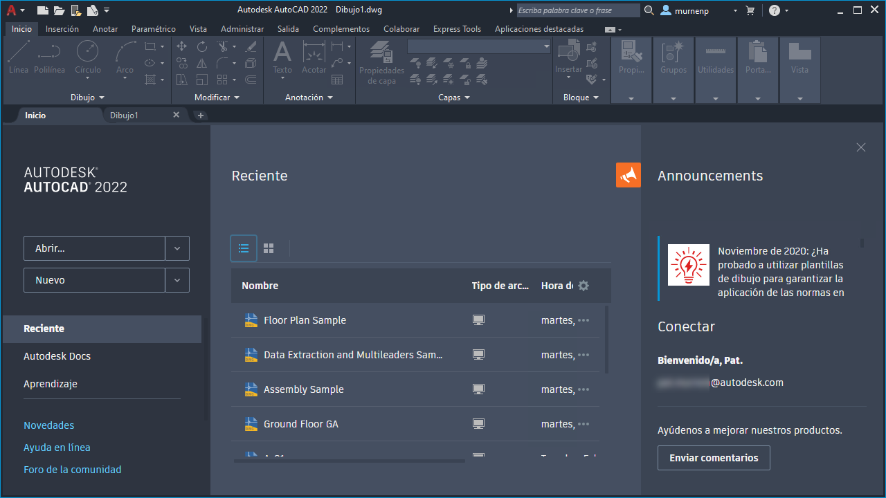 La ficha Inicio se ha rediseñado para proporcionar una experiencia de bienvenida coherente a los productos de Autodesk.