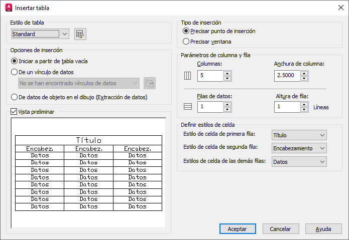 Controla si se muestra una vista previa. Si comienza a partir de una tabla vacía, la vista previa mostrará un ejemplo del estilo de tabla. Si crea un vínculo de tabla, la vista previa mostrará la tabla resultante. Si desea mejorar el rendimiento al trabajar con tablas grandes, desactive esta opción.