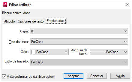 Define la capa en la que se encuentra el atributo, así como el color, el grosor de línea y el tipo de línea del atributo. En el caso de que el dibujo utilice estilos de trazado, podrá asignarle uno al atributo mediante la ficha Propiedades.