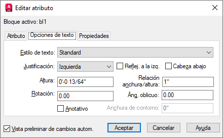 Controla si se debe actualizar el área de dibujo inmediatamente para que se muestren los cambios de atributo visibles que se hayan realizado. Si la casilla Vista preliminar de cambios autom. está marcada, los cambios se aplicarán acto seguido. En el caso contrario, éstos no podrán verse inmediatamente.