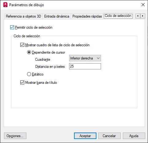 El ciclo de selección permite seleccionar los objetos que se superponen pulsando la tecla Mayús + barra espaciadora. Permite controlar si se muestra un icono azul para indicar los objetos que se superponen y se pueden configurar los parámetros de visualización del cuadro de lista Selección.