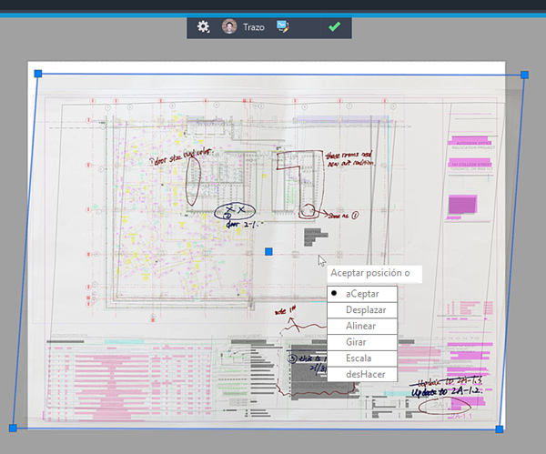 Utilice Importar marcas de revisión para colocar una versión con marcas de revisión del dibujo sobre el archivo original a fin de facilitar la visualización y la incorporación de cambios en el dibujo. Por ejemplo, si tiene una versión en PDF del dibujo en la que se han añadido texto y notas de revisión, utilice la opción Importar marcas de revisión para superponer el dibujo revisado sobre el original. O bien, si tiene una versión impresa del dibujo que contiene notas de revisión escritas a mano, puede capturar una fotografía de la versión impresa y, a continuación, importarla como un archivo JPG o PNG.