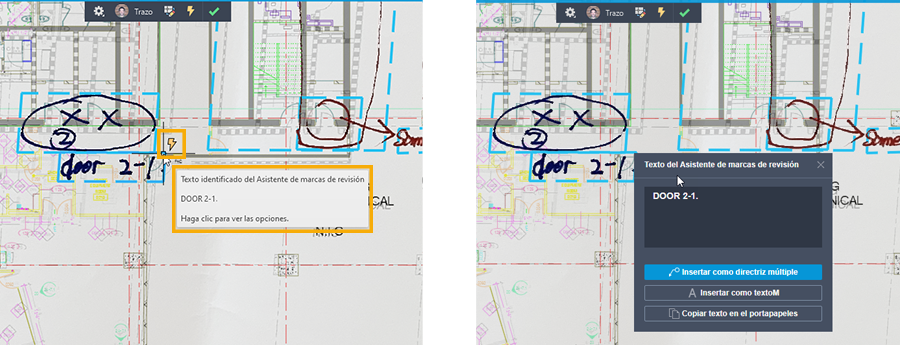 El Asistente de marcas de revisión identifica automáticamente las marcas de revisión como texto y nubes de revisión. Después de importar una marca de revisión, active VISTATRAZO para activar el modo de trazo que permite modificar el dibujo en sí.