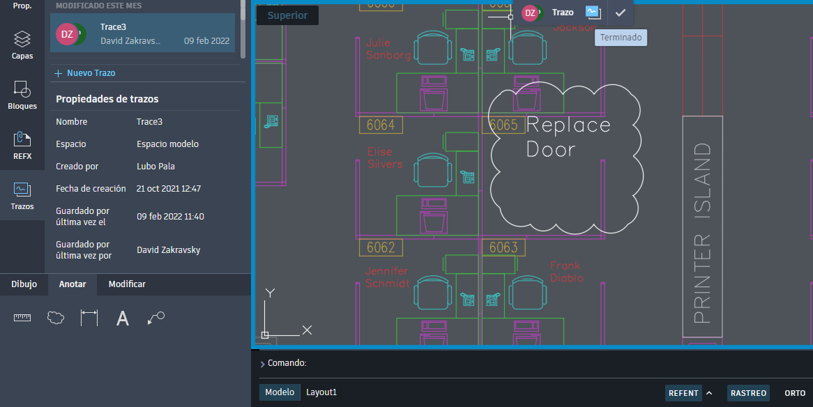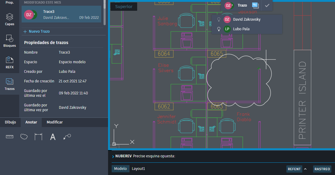 La función Trazo proporciona un espacio seguro para incluir comentarios en un dibujo sin modificar el dibujo existente. Se puede utilizar la analogía de un papel de calco de colaboración virtual que se coloca sobre el dibujo y permite a los colaboradores añadir marcas de revisión y comentarios en él.
