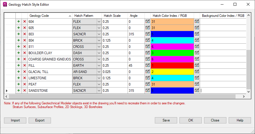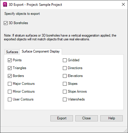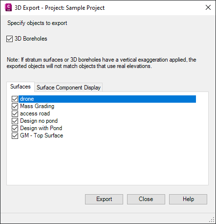 Use this window and tabs to export 3D boreholes and stratum surfaces to a new Civil 3D drawing and to configure the stratum surface components to be exported.