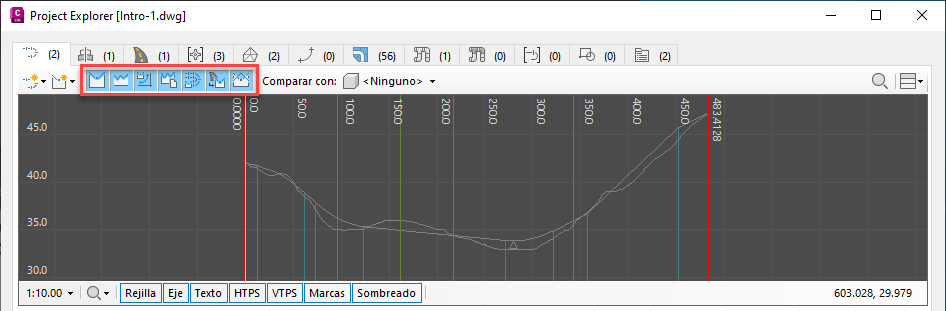 El valor de deformación vertical y los parámetros de visualización/ocultación de cada componente visual de una vista de perfil o en sección determinada también se pueden controlar desde los controles de vista asociados en la ventana principal de Project Explorer, como se indica a continuación.