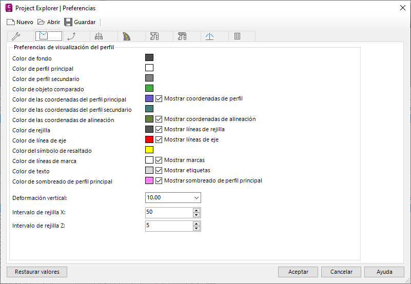 Las cinco fichas restantes de la ventana Preferencias de Project Explorer controlan los parámetros de color, estilo, rejilla y escala de las distintas vistas de perfil y en sección de la ventana principal de Project Explorer.