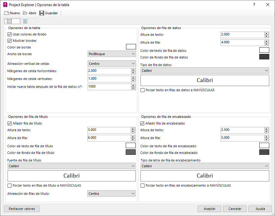 Las Opciones de tabla determinan el color del borde, el tamaño y el tipo de fuente, los márgenes de celda y el estilo visual general de todas las tablas de AutoCAD generadas a partir del Project Explorer.