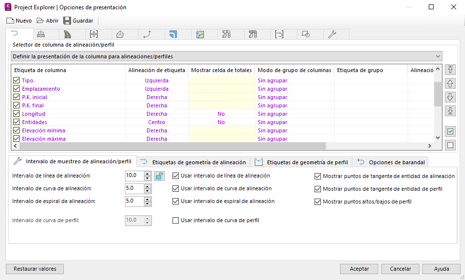 Además de las opciones de etiquetado y diseño de columna estándar, la ficha Alineaciones de la ventana Opciones de diseño ofrece una serie de opciones dedicadas para controlar la visualización y el formato de datos de entidad y P.K. relacionados con perfiles y alineaciones.