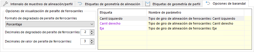 La ficha Opciones de barandal incluye Opciones de visualización de peralte de ferrocarriles y una lista de etiquetas. Puede utilizar el cuadro Opciones de visualización de peralte de ferrocarriles para controlar el valor Degradado de peralte de ferrocarriles en la ficha Curvas de peralte de ferrocarriles. La lista de etiquetas permite editar el nombre de las etiquetas de barandal en el dibujo. Después de editar una etiqueta en el cuadro de diálogo Opciones de barandal, se actualizan las etiquetas de la ventana principal de Project Explorer, la ficha Alineaciones, la lista P.K. calculados y el Tipo de giro de barandal.