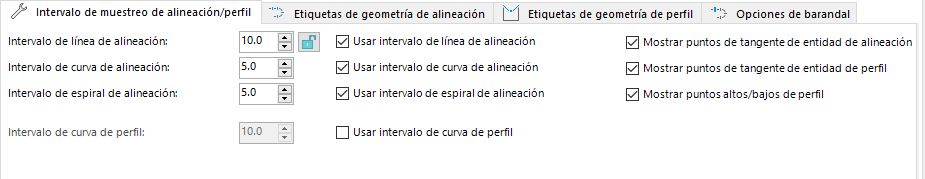 Defina el intervalo de muestreo de P.K. para alineaciones en entidades de línea, espiral y curva. Si lo desea, puede desactivar el intervalo para determinados tipos de entidad, lo que puede resultar útil si solo se necesitan puntos de intervalo en espirales o curvas. Para utilizar un intervalo de alineación común para todos los tipos de entidad, utilice el botón de verificación Bloquear intervalos de P.K.