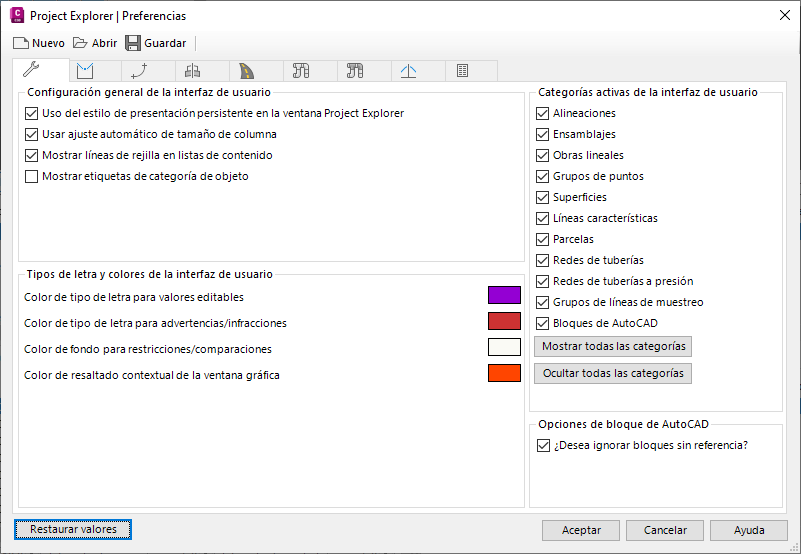 Las Preferencias determinan cualquier aspecto de la interfaz de usuario de Project Explorer que no sea relevante para la generación de informes. Por ejemplo, los esquemas de color y los parámetros de escala por defecto para las vistas de perfil y en sección, la configuración de fuente para la interfaz de usuario, la visibilidad y el diseño de panel para cada ficha Categoría de objeto individual en la ventana Project Explorer.