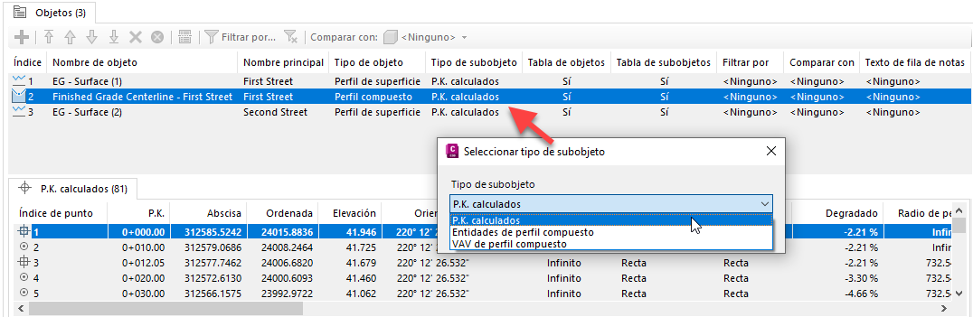 Para algunos tipos de objeto de Civil 3D, hay disponibles tipos de subobjeto para un Elemento de conjunto de objetos de la lista. Por ejemplo, para las alineaciones, es posible generar un informe que incluya P.K. calculados, entidades de alineación, PI de alineación o P.K. críticos de peralte.