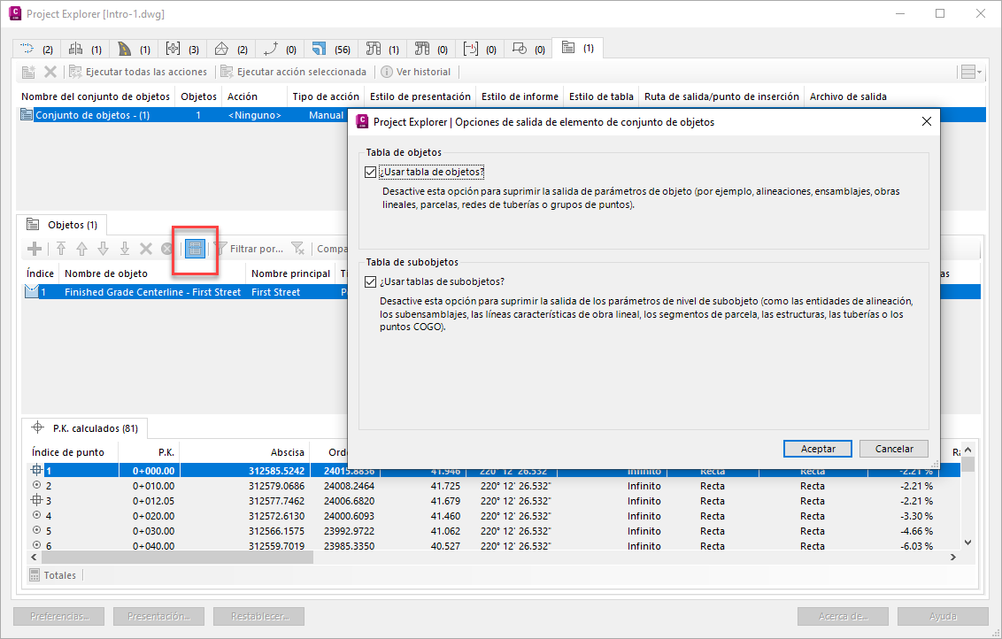 Un Conjunto de objetos es una lista de objetos de Civil 3D que el usuario puede definir y a la que se puede asignar una acción y otros detalles relacionados. Las acciones se pueden activar manualmente o, en algunos casos, dinámicamente cuando Project Explorer detecta que se ha modificado una pieza dependiente del diseño. Por lo general, los Conjuntos de objetos se utilizan para automatizar la producción de informes preconfigurados, hojas de cálculo, dibujos de AutoCAD o tablas de AutoCAD, y la combinación exacta de estilos, filtros e instrucciones de salida necesarios depende del tipo de acción y objeto que se asigne.