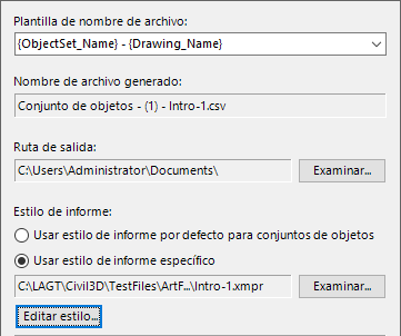 | Informe a archivo CSV | Utilice la opción Informe a archivo CSV para generar un archivo de informe de salida en formato CSV cuando se haga clic en el botón Ejecutar acción. Para usar esta opción, es necesario seleccionar un Estilo de diseño, que determina el diseño y el tipo de archivo del informe, así como una ruta de salida. |