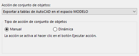 Se puede asignar una acción opcional de Conjunto de objetos a cada Conjunto de objetos. Las acciones se utilizan normalmente para automatizar el proceso de generación de informes, hojas de cálculo o tablas de AutoCAD. El parámetro Tipo de acción de conjunto de objetos determina cómo se debe activar la acción asignada, ya sea de forma manual o dinámica.