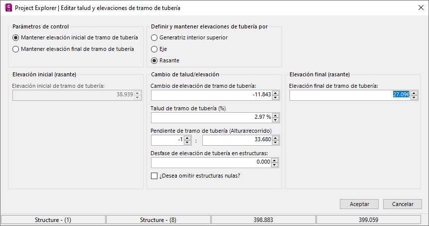 Se puede aplicar un nuevo valor de pendiente de tubería mientras se mantiene la elevación del inicio o el final del conducto de tubería seleccionado. Si se realizan cambios en el diámetro de las tuberías del conducto actual, se puede optar por mantener las elevaciones invertidas, de generatriz interior superior o eje de las tuberías al cruzar cada estructura. La pendiente de tubería se puede expresar en porcentaje o conducto:altura, y se puede aplicar opcionalmente un desfase de elevación al cruzar cada estructura en el conducto de tubería.