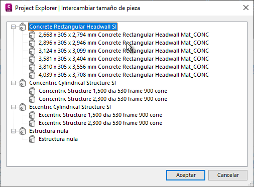 Para modificar el tamaño de pieza de varias estructuras o tuberías, seleccione la ficha Redes de tuberías en la ventana Project Explorer y asegúrese de que la ficha de subobjeto Estructuras o Tuberías esté activa. Seleccione las estructuras o las tuberías a las que desea asignar el nuevo tamaño de pieza y, a continuación, seleccione Intercambiar piezas en el menú contextual. Los cambios se reflejan instantáneamente en la ventana de AutoCAD y la ventana Project Explorer.
