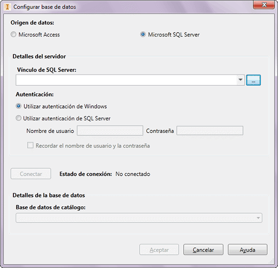 Especifique el tipo de base de datos para el origen de la información de catálogo.