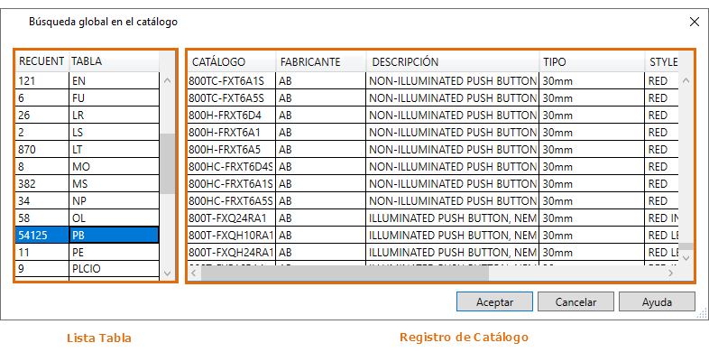 Nota: Los elementos de subensamblaje, definidos por un valor LISTAENSAMB, se incluyen en los resultados de la búsqueda. Los resultados de la búsqueda global se basan en los registros de las columnas Catálogo, Fabricante y Código de montaje.