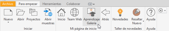 Se puede acceder a los aprendizajes haciendo clic en la Galería de aprendizaje de la ficha Para empezar, panel Mi página de inicio de la cinta de opciones.