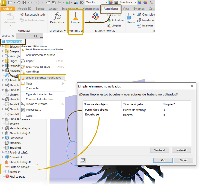 Ahora es posible utilizar las teclas de método abreviado del menú contextual para editar bocetos u operaciones directamente. Seleccione una operación o un boceto, haga clic con el botón derecho y utilice la tecla de método abreviado. Están disponibles las siguientes teclas de método abreviado: