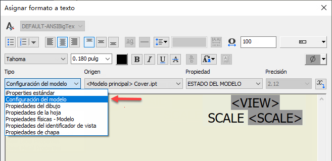 Se añade una nueva categoría "Configuración del modelo" al cuadro combinado Tipo del cuadro de diálogo Asignar formato a texto, que permite configurar identificadores de vista para que muestren un nombre de estado del modelo en las vistas de dibujo. Las modificaciones realizadas en el estado del modelo de vista se reflejan en el identificador de vista.