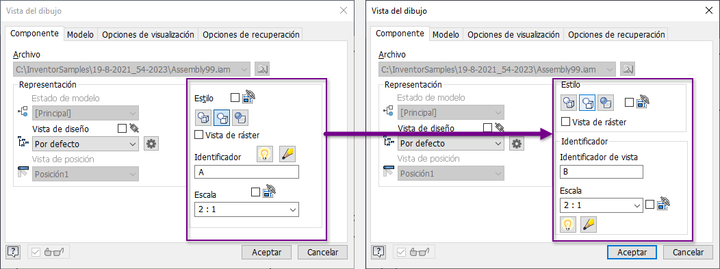 Nombre de estado de modelo en el identificador de vista en dibujos