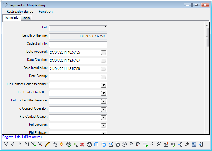 La Tabla de datos muestra elementos geoespaciales en un formato de tabla. El Visor de datos muestra los datos externos vinculados a los objetos de dibujo. Los formularios de clases de elemento muestran los datos de atributos para los elementos de modelo de sector.