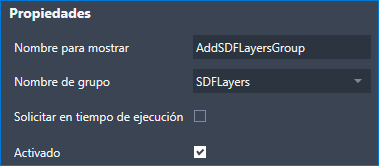 La nueva actividad Añadir grupo crea un grupo para contener las capas nuevas. Dado que la actividad LoopAddLayers añade capas al grupo, el grupo se debe crear antes de que comience la actividad de bucles.