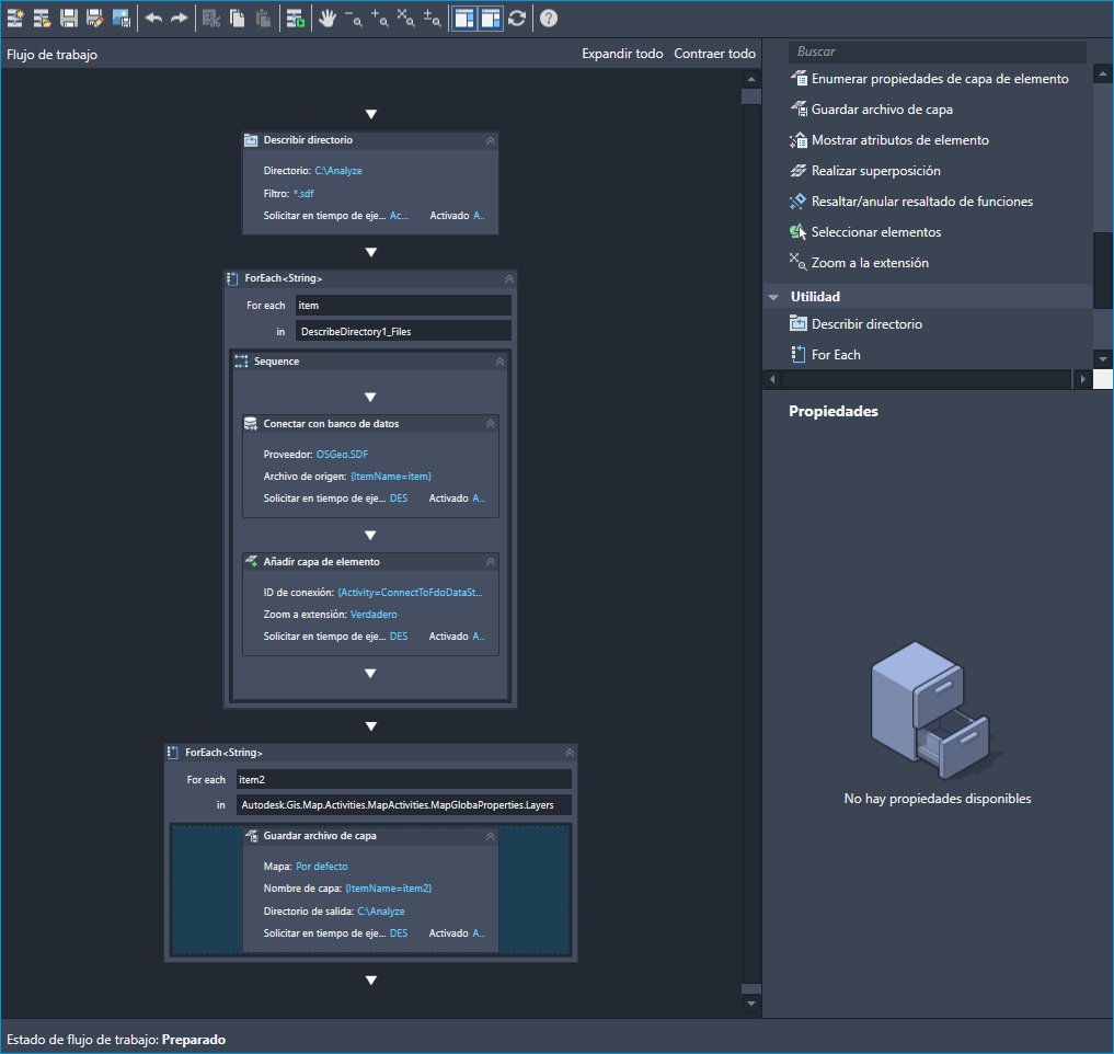 En este caso, la actividad ForEach se ha cambiado de nombre a “LoopAddLayers” para describir su funcionamiento. La actividad examina cada archivo SDF en la carpeta indicada en la actividad Exponer contenido del directorio. Para cada iteración, se conecta a un archivo SDF y añade una capa de elemento al Administrador de visualización.