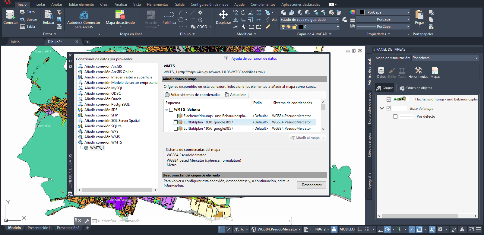 El conjunto de herramientas AutoCAD Map 3D 2021 permite acceder a los datos de Web Map Tile Service (WMTS) e incorporarlos a su dibujo. Para obtener más información, consulte los temas de Ayuda sobre WMTS.