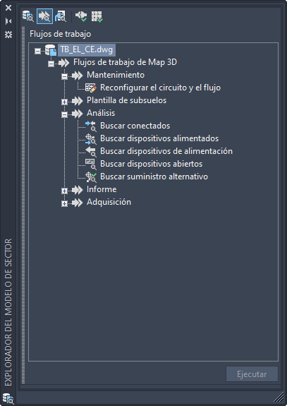 Para obtener una experiencia visual mejorada, los controles de la cinta de opciones del modelo de sector y las vistas de explorador, como por ejemplo el Explorador del modelo de sector, el Explorador de flujo de trabajo, el Explorador de componentes eléctricos, etc., se han actualizado para admitir el tema oscuro en el conjunto de herramientas AutoCAD Map 3D 2021.