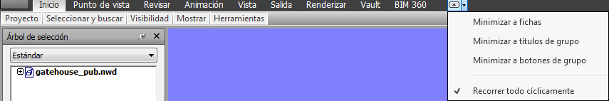 - Recorrer todo cíclicamente: recorre los cuatro estados de la cinta de opciones en el siguiente orden; cinta completa, minimizada a botones de panel, minimizada a títulos de panel y minimizada a fichas.