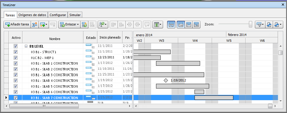 Autodesk Navisworks TimeLiner admite la estructura jerárquica de tareas, según se importe de un origen de datos como, por ejemplo, Microsoft Project™ (consulte la ficha Origen de datos para obtener más información). La jerarquía puede expandirse o contraerse haciendo clic en los signos de más o menos, respectivamente, que aparecen a la izquierda de la tarea.