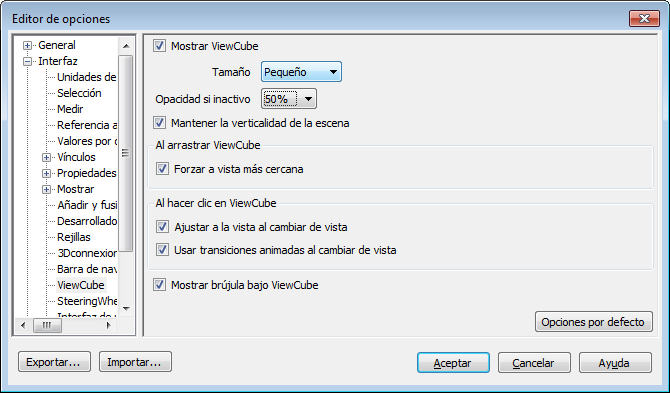 En el Editor de opciones > nodo de Interfaz > página ViewCube, seleccione una opción de la lista desplegable Tamaño.