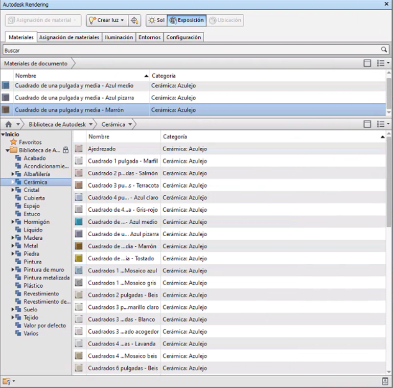 En la ficha Materiales, examine la biblioteca de Autodesk y haga clic en un tipo de material para seleccionarlo.