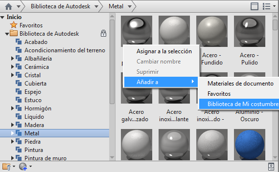 En la ficha Materiales, haga clic con el botón derecho en la muestra de material > Añadir a y seleccione el nombre de la biblioteca en la que desea que el material se agregue. Si no hay ninguna biblioteca personalizada, primero tendrá que crear una.