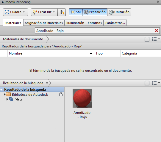 En el panel de bibliotecas de materiales se muestran las bibliotecas de materiales que contienen coincidencias para la frase de búsqueda introducida.