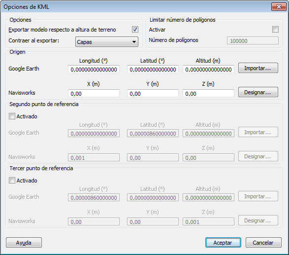 Estos puntos deben ser visibles en la Vista de escena antes de exportar, ya que, una vez que se abra el cuadro de diálogo Opciones de KML, no podrá navegar antes de designarlos.