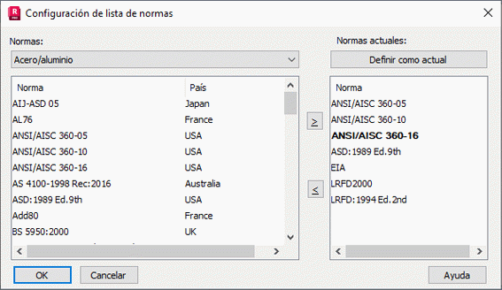 Utilice este cuadro de diálogo para configurar la lista de normas disponibles para normas de diseño y cargas.