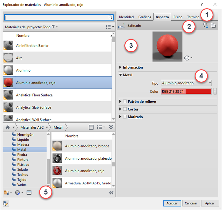 | 4 | Panel Propiedades: permite consultar y gestionar las propiedades detalladas para el objeto seleccionado. El nombre del activo y su descripción aparecen debajo del grupo desplegable Información. En el anterior ejemplo, se muestran expandidas las propiedades de Metal para el objeto Apariencia Anodizado - Rojo". Por ejemplo, el conjunto de propiedades que se muestra para un líquido es diferente al que se muestra para un metal. |