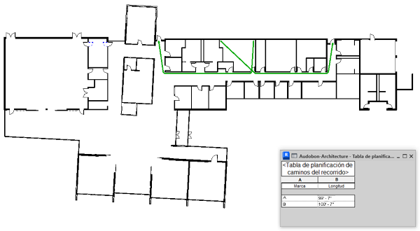 En la mayoría de los diseños, podrá identificar los espacios que se deberán evaluar para obtener las distancias máximas del recorrido. Utilice las herramientas de análisis de ruta para encontrar la distancia del recorrido real. En el vídeo de ejemplo, se añaden dos líneas de camino del recorrido a las esquinas más distantes de la habitación, que se encuentran más alejadas de las salidas. Se utiliza una tabla de planificación para enumerar las longitudes de las líneas de recorrido. La tabla de planificación identifica el camino "A" como la distancia máxima a la salida más próxima.